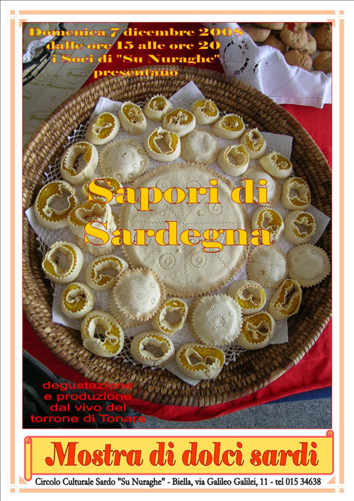 Domenica 7 dicembre, esposizione: dalle ore 15 alle ore 20 nei saloni del "Punto Cagliari" - Circolo Culturale Sardo "Su Nuraghe" di Biella verrà presentata la "Mostra di dolci sardi" preparati dalle abili mani delle Socie del Sodalizio dei Sardi di Biella.