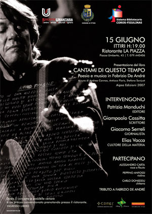A Ittiri, domenica 15 giugno, si terrà l’incontro organizzato dal Sistema Bibliotecario Coros-Figulinas e la Società Umanitaria di Alghero, con la collaborazione del Comune di Ittiri e la Comes - Cooperativa Mediateche Sarde e sponsorizzato dall'Hotel Carlo Felice di Sassari. Il volume raccoglie i materiali elaborati intorno al convegno dedicato a Fabrizio De André, che ha avuto luogo a Cagliari nel giugno 2003. Nella prima sezione, Orizzonti, curata da Andrea Cannas, vengono presentati gli scritti che trattano in generale il rapporto tra canzone, letteratura e utopia in Fabrizio De André. Nella seconda sezione intitolata "Percorsi", curata da Antioco Floris, l’attenzione si è focalizzata su album, singoli brani o specifiche problematiche dell’immaginario che intorno alla sua figura è andato definendosi in quarant’anni di attività. La terza sezione del volume, curata da Stefano Sanjust e intitolata Variazioni, esplora la componente sonora, mettendo a fuoco alcuni aspetti di De André musicista: i legami con la tradizione musicale italiana, le contaminazioni con le altre culture, le caratteristiche del timbro della voce.